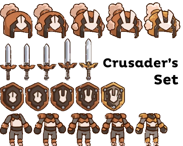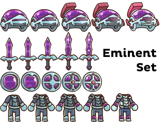The Equipment in Postknight are items that the main character can wear that provide stat bonuses and special buffs. They can be acquired by completing Main Quest activities or by purchasing from the Merchants in each area. There are four types of equipment: Weapons, Shields, Armour, and Helms. Each is broken into sets and tiers. There are a specific number of sets in each tier, and each tier drops from a specific area in the game. Each piece can be upgraded up to 5 stars for better stat bonuses. This is done at the Blacksmith in each area in exchange for Coins and certain items.