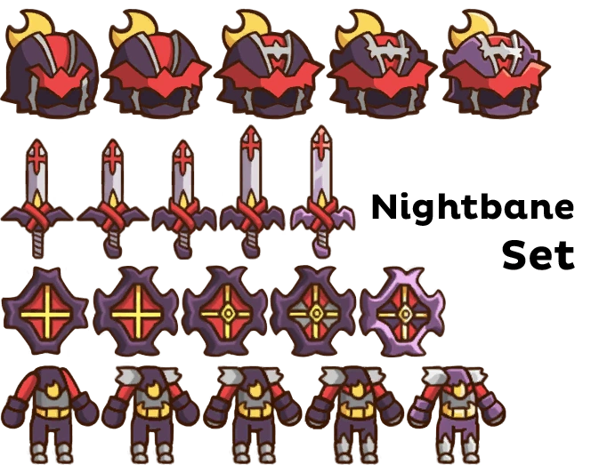 | Nightbane Guard | Ranged Defense +52 | Robustic II - Increases damage by 15% | Miner's Den II | 139500 Coins, 243 Gold Ore, 122 Elder Pine Log, 42 Mimic Core, 22 Valley Gauze, 2 Crystabit |